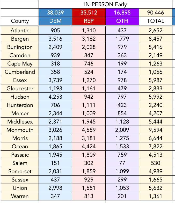 Republican voters overwhelmingly dominated the first day of early voting in 9 of New Jersey’s 21 counties, including the five southernmost New Jersey counties where I live and work. In Atlantic, Cape May, Cumberland, Ocean, and Salem counties Republicans outvoted Democrats by almost a 2:1 ratio. 54% of all ballots recorded on Saturday were cast by registered Republicans.